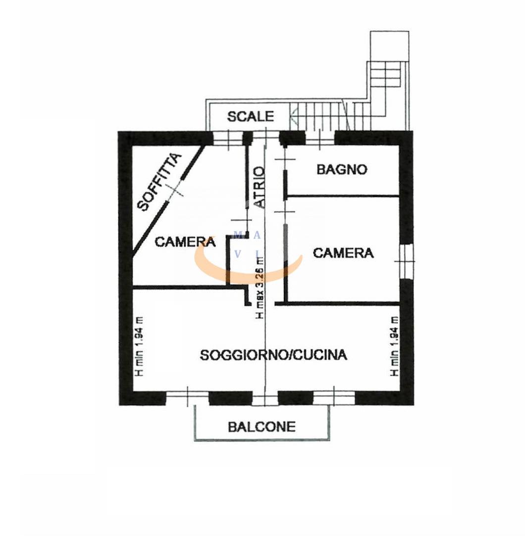 On the second floor, three-room apartment with exposed beams (entrance, bathroom with window, two double bedrooms, living room/kitchen and balcony)
