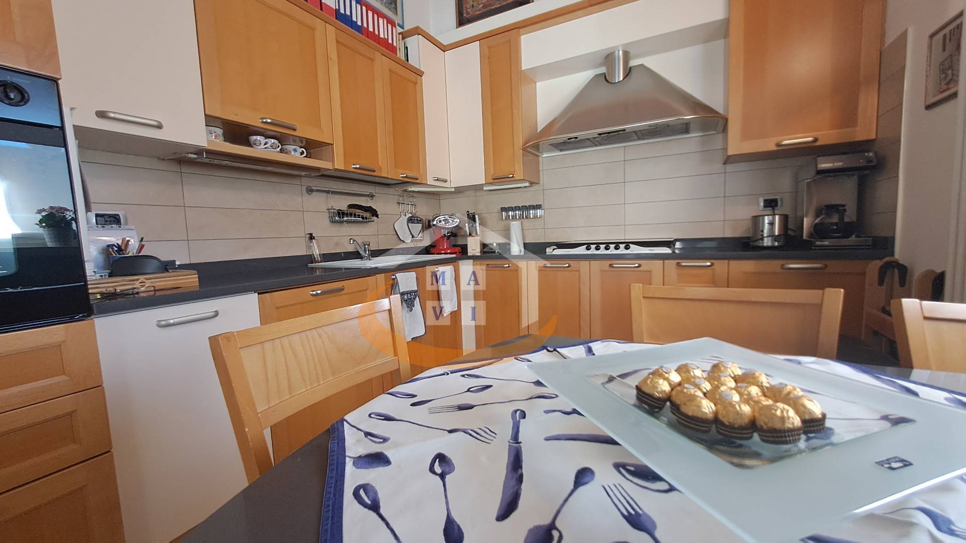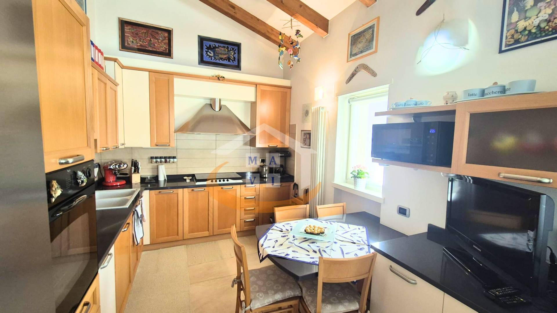 The apartment, accessible by elevator, comprises an entrance hall, living room, kitchen, utility room, bathroom with window, two bedrooms, and a large southwest-facing terrace, ideal for relaxing or enjoying al fresco lunches and dinners. The eat-in kitchen is separated from the living room by a large glass door, allowing the spaces to be divided as needed without sacrificing natural light.
