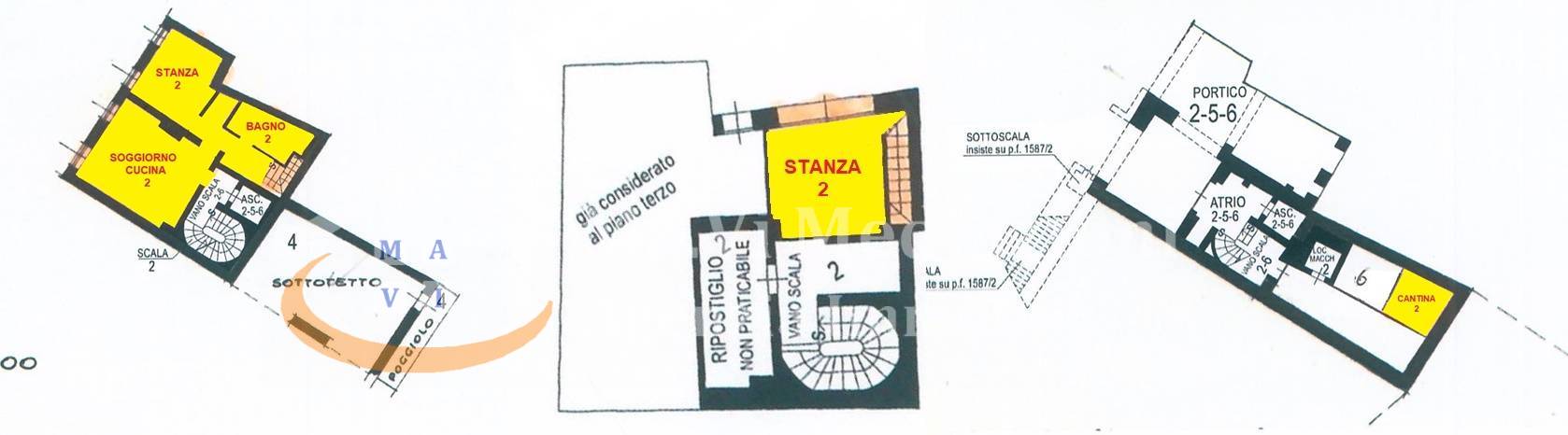 - Piano secondo: ingresso, soggiorno con angolo cottura, disimpegno, camera matrimoniale e bagno; scala interna di collegamento al piano superiore.